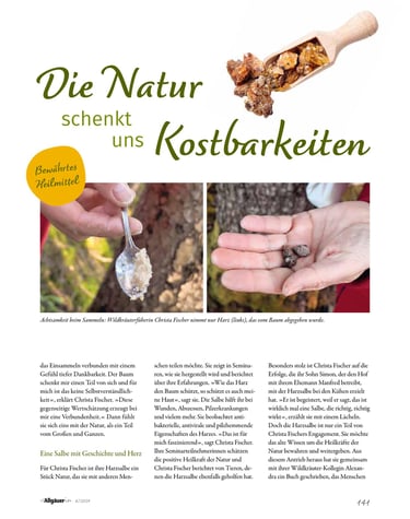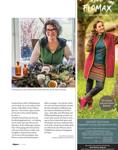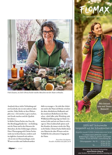 Aufgewachsen auf einem malerischen Allgäuer Bauernhof, umgeben von sanften Hügeln, dichten Wäldern und blühenden Wiesen durfte ich von klein auf die unberührte Natur in all ihren Facetten erleben. Für uns war selbstgemachter Kräutertee anstelle von Limonade, das Getränk der Wahl. Mein Vater sammelte dafür mit viel Liebe die Kräuter. Eine wertvolle Tradition, die von Generation zu Generation weitergegeben wurde. Die Natur war für mich stets ein Ort der Geborgenheit und inneren Ruhe, die mich durch die Stürme und Sonnentage des Lebens getragen hat. Sie war mein treuer Begleiter und eine unerschöpfliche Quelle der Inspiration. Bereits im zarten Alter von fünf Jahren habe ich mein erstes Herbarium angelegt und spürte schon damals, dass der Weg meines Lebens eng mit der Natur verbunden sein würde.